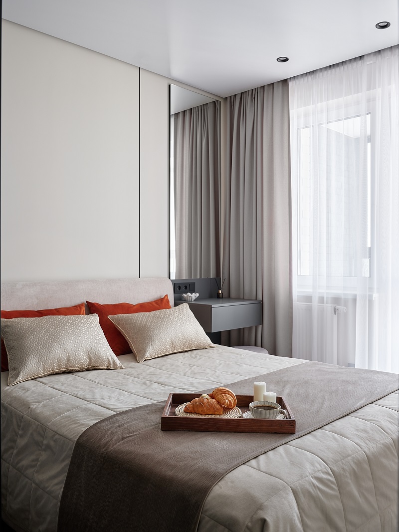 В этой спальне (проект дизайнера Юлии Грудининой) есть серый цвет разных уровней: и светлый, и более насыщенный; и тёплый, и холодный. Несмотря на этот приём без терракотового акцента всё слилось бы в одно пятно. Терракот, использованный точечно, сделал этот интерьер стильным, современным и при этом нескучным и тёплым.